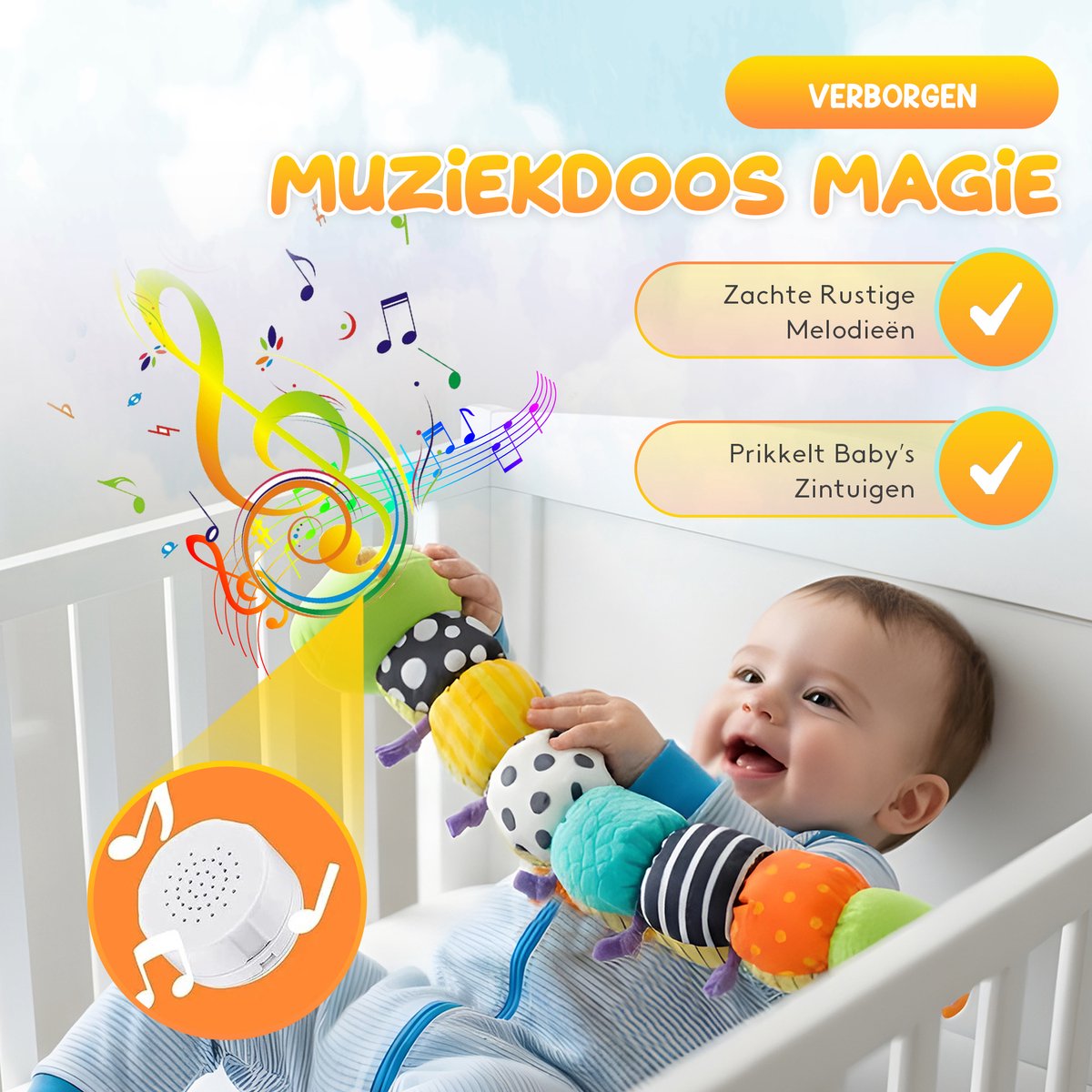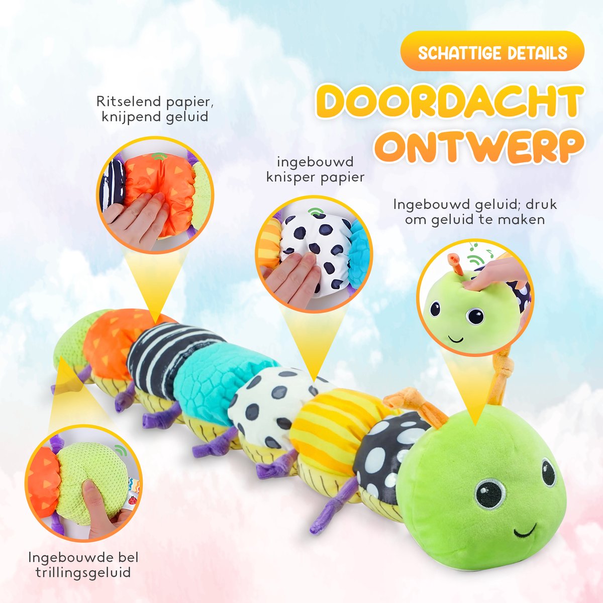 Heldere kleuren, verschillende texturen en zachte geluidjes prikkelen tastzin, zicht en gehoor. -