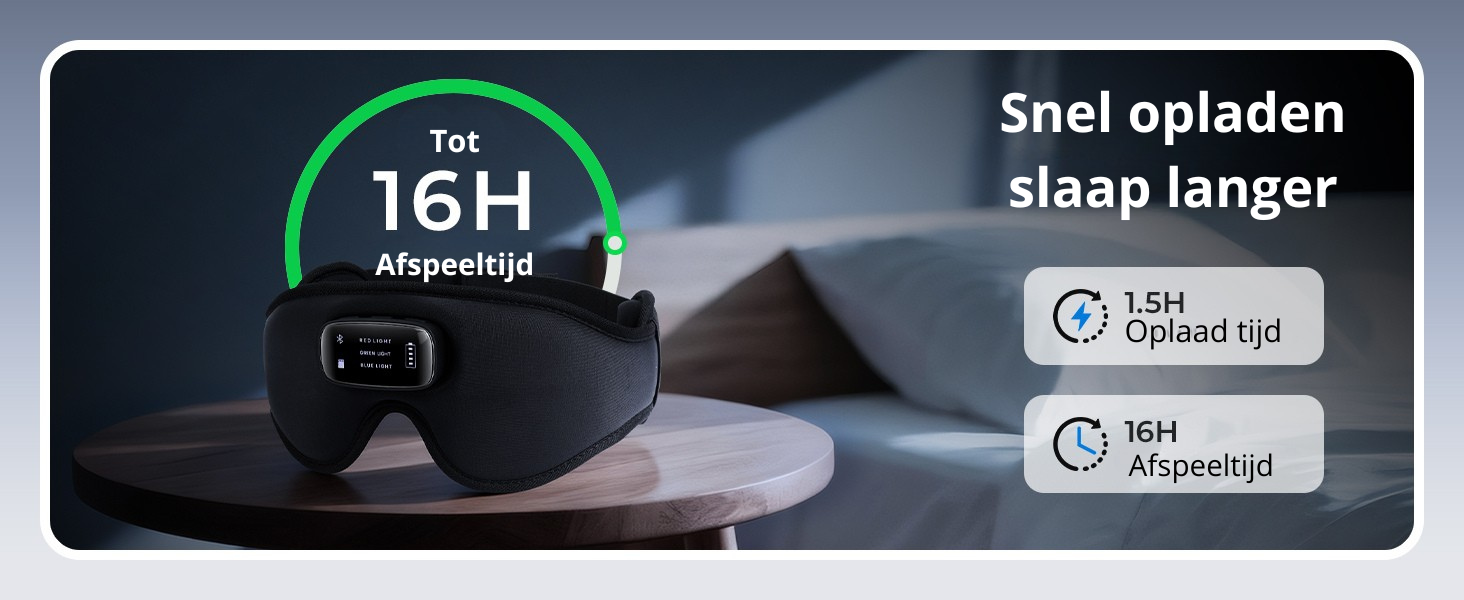 Op een volle lading gaat de batterij tot 16 uur mee, perfect voor een hele nacht slapen. Opladen duurt ongeveer 1,5 uur via de meegeleverde USB-kabel.